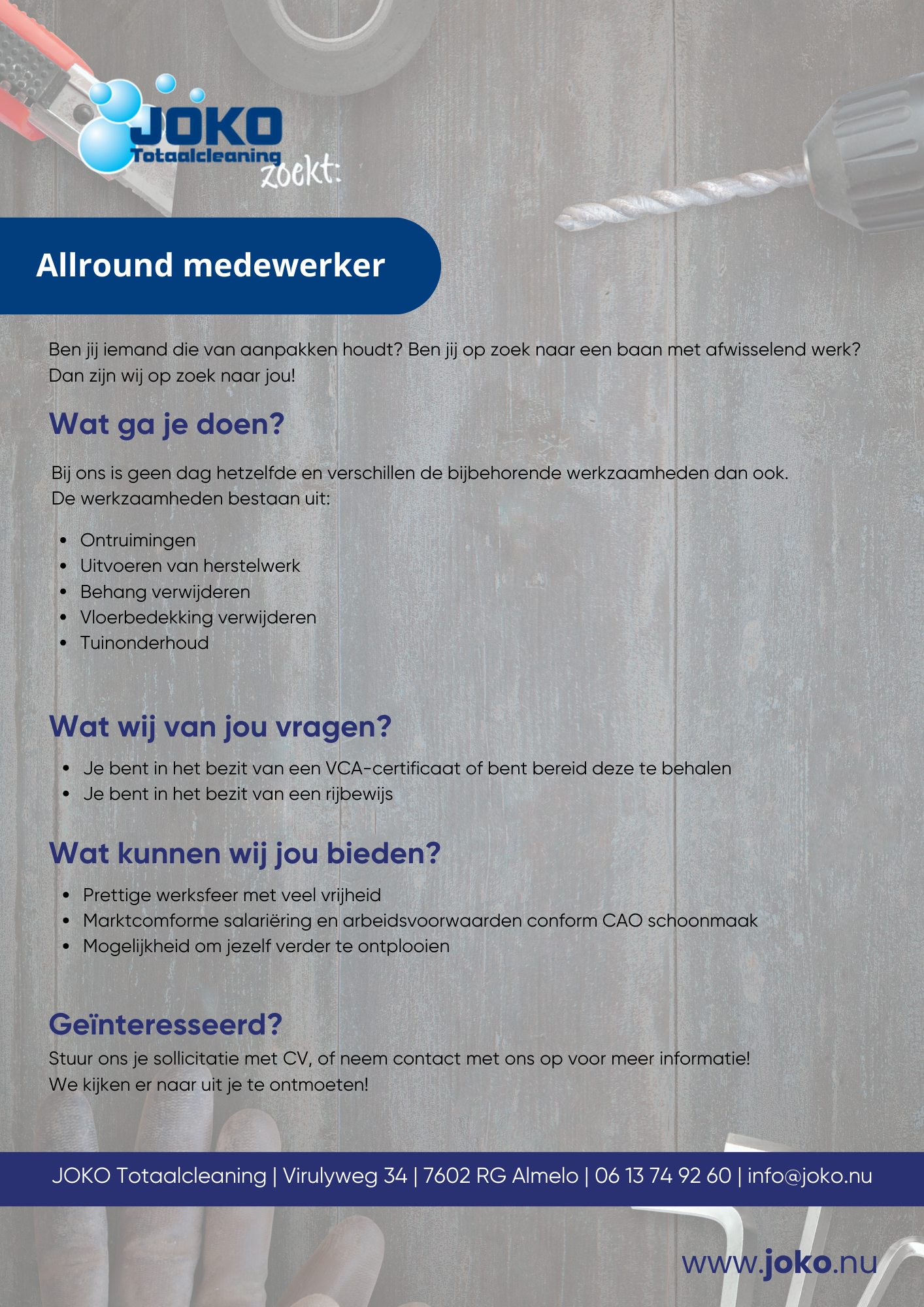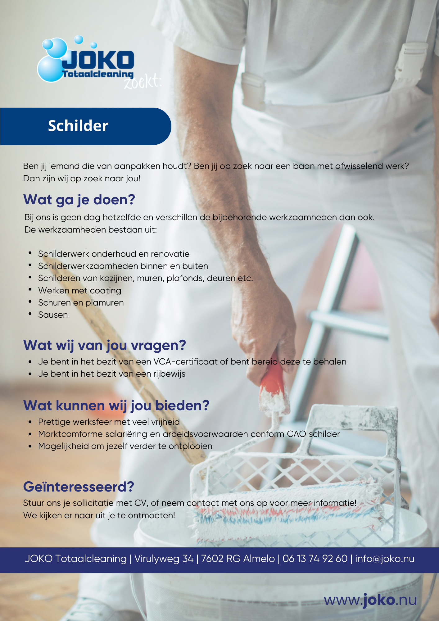 Bij Joko Totaalcleaning zijn we voortdurend op zoek naar nieuwe vakmensen, ongeacht hun leeftijd. Hieronder vind je een overzicht van de vacatures die momenteel openstaan. Als een van deze functies je aanspreekt, klik er dan op voor meer informatie en neem contact met ons op.